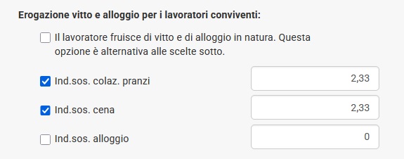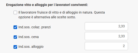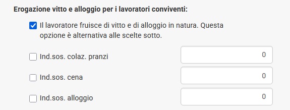 Se invece le parti concordano che il vitto e l'alloggio venga interamente corrisposto in denaro, è necessario selezionare tutte le opzioni come nella foto seguente: