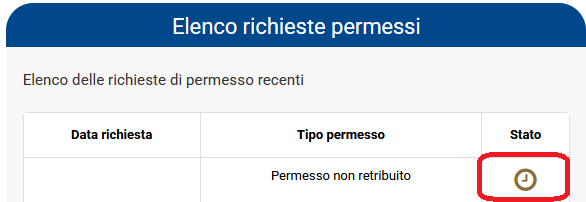 Come si vede nella figura a seguire, nella riga di ciascuna richiesta viene evidenziata prima la data di richiesta del permesso, poi la tipologia di richiesta ( ferie - permesso non retribuito - malattia ) e lo stato della richiesta che in questo momento ( non ancora approvato ) sarà evidenziato da un orologio di colore arancione. ( fig. 5 )