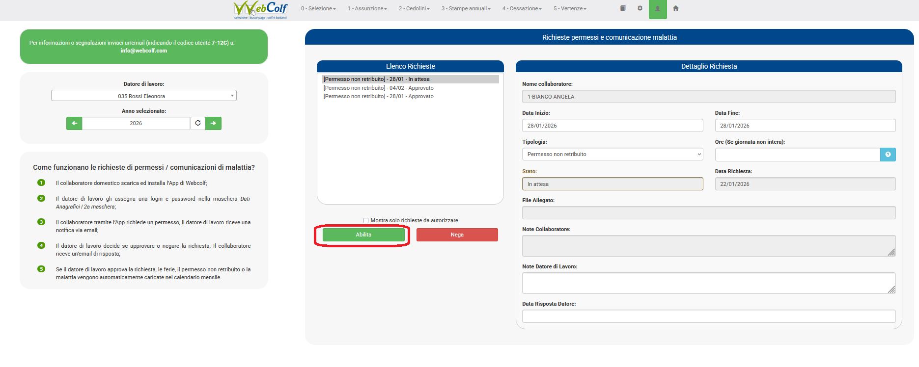 Il datore è pronto per accettare la richiesta o in alternativa di negarla mediante i rispettivi tab 'abilita' in verde e 'nega' in rosso a sinistra dello schermo sotto l'elenco delle richieste. ( fig. 6 ).