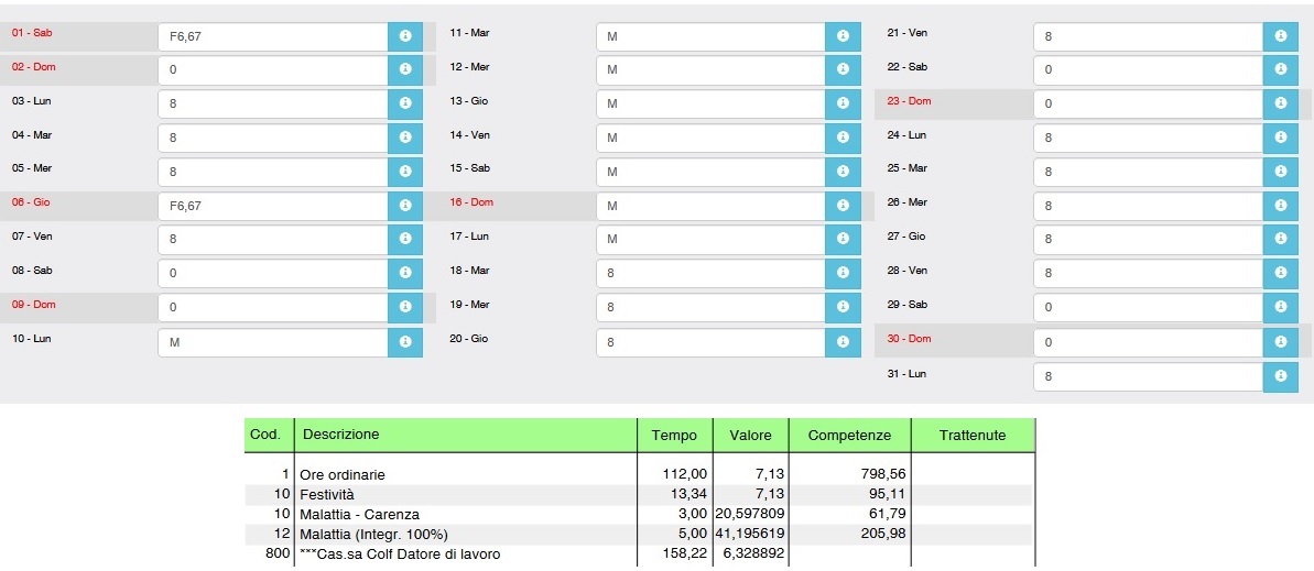 Nell'immagine sotto si riporta un esempio di inserimento delle presenze e relativa busta paga di una badante non convivente, assunta per 40 ore settimanali a 7,13 € l'ora che ha un certificato di malattia di 8 giorni.