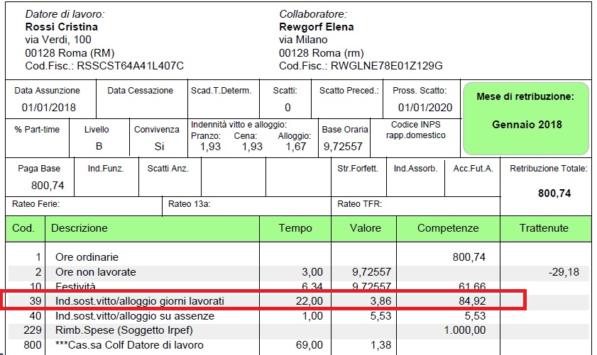 Se solo una parte del vitto e alloggio viene corrisposta in natura il resto dev'essere corrisposto in denaro. Per esempio se il collaboratore domestico dorme presso il datore ma non gli vengono corrisposti i pasti é necessario apporre i relativi flag per pagarli per ogni giorno lavorativo, esempio: