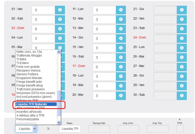 2) Nel caso in cui invece, si voglia dare solo un acconto, si dovrebbe selezionare, da una delle tre righe in basso con menù a tendina, la voce "Anticipo su TFR" indicando poi sotto la colonna "Imp. totale" l'importo che si desidera liquidare.