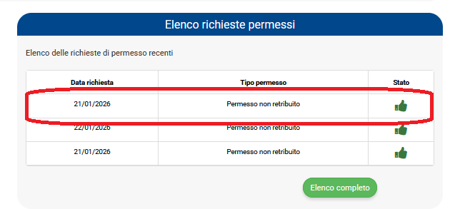 Una volta che il collaboratore avrà inviato la propria richiesta, il datore riceverà un'email di richiesta e troverà nell'home page del programma il widget 'Elenco richieste permessi' all'interno del quale sarà possibile consultare l'elenco delle richieste di permessi recenti, in ordine dall'ultima richiesta a quelle precedenti.