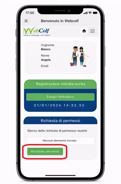 Il collaboratore dovrà quindi posizionarsi sul tab verde 'Richiesta permessi'.